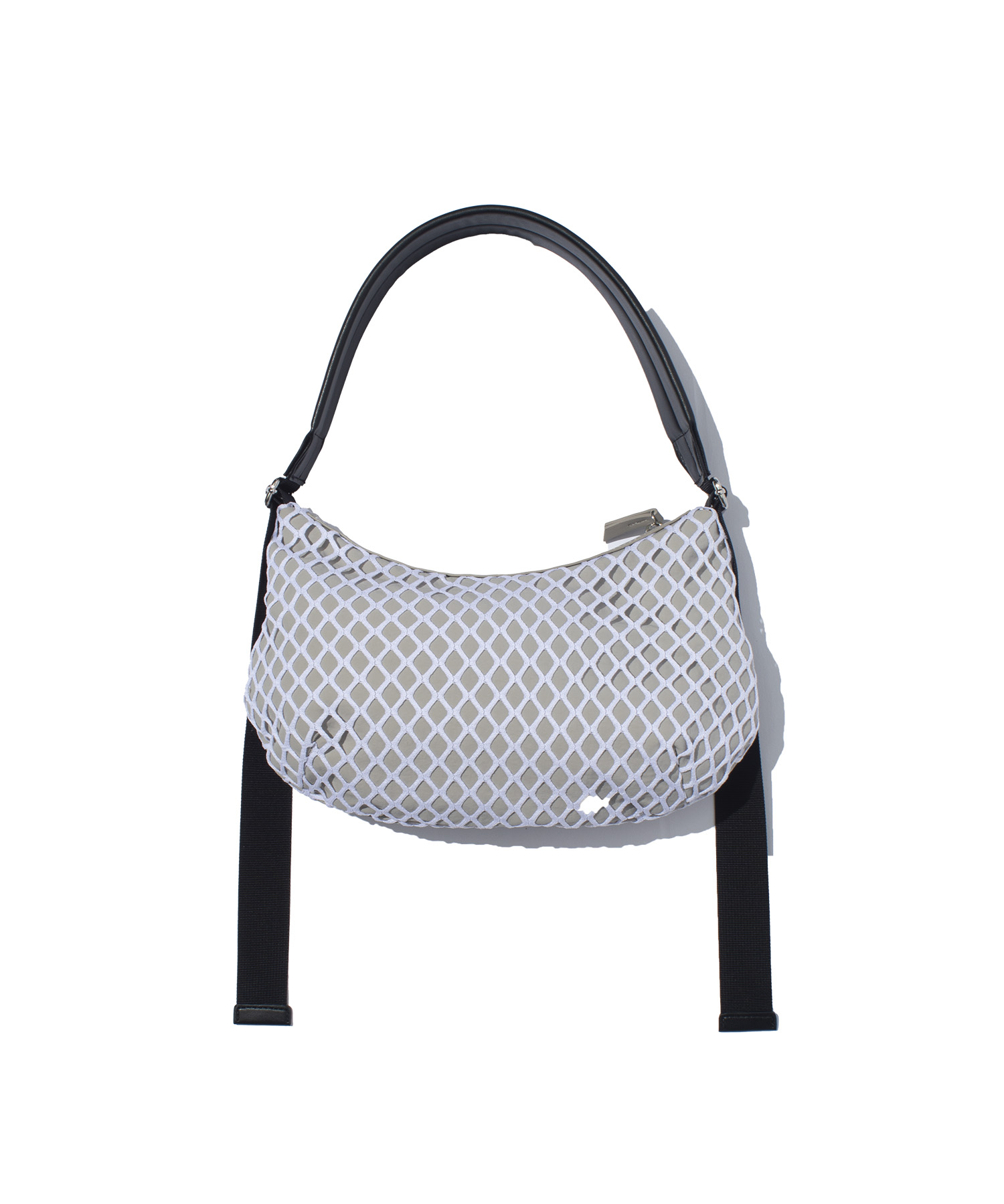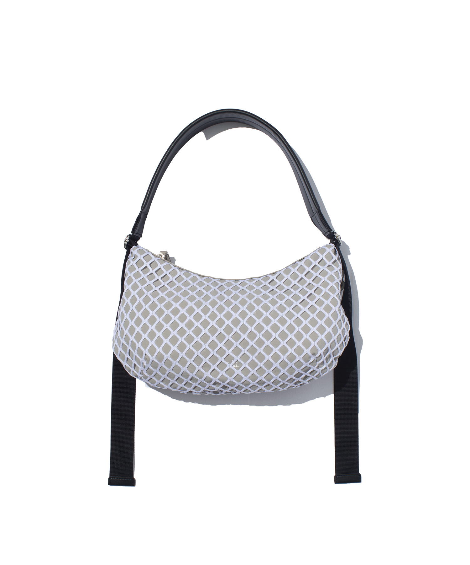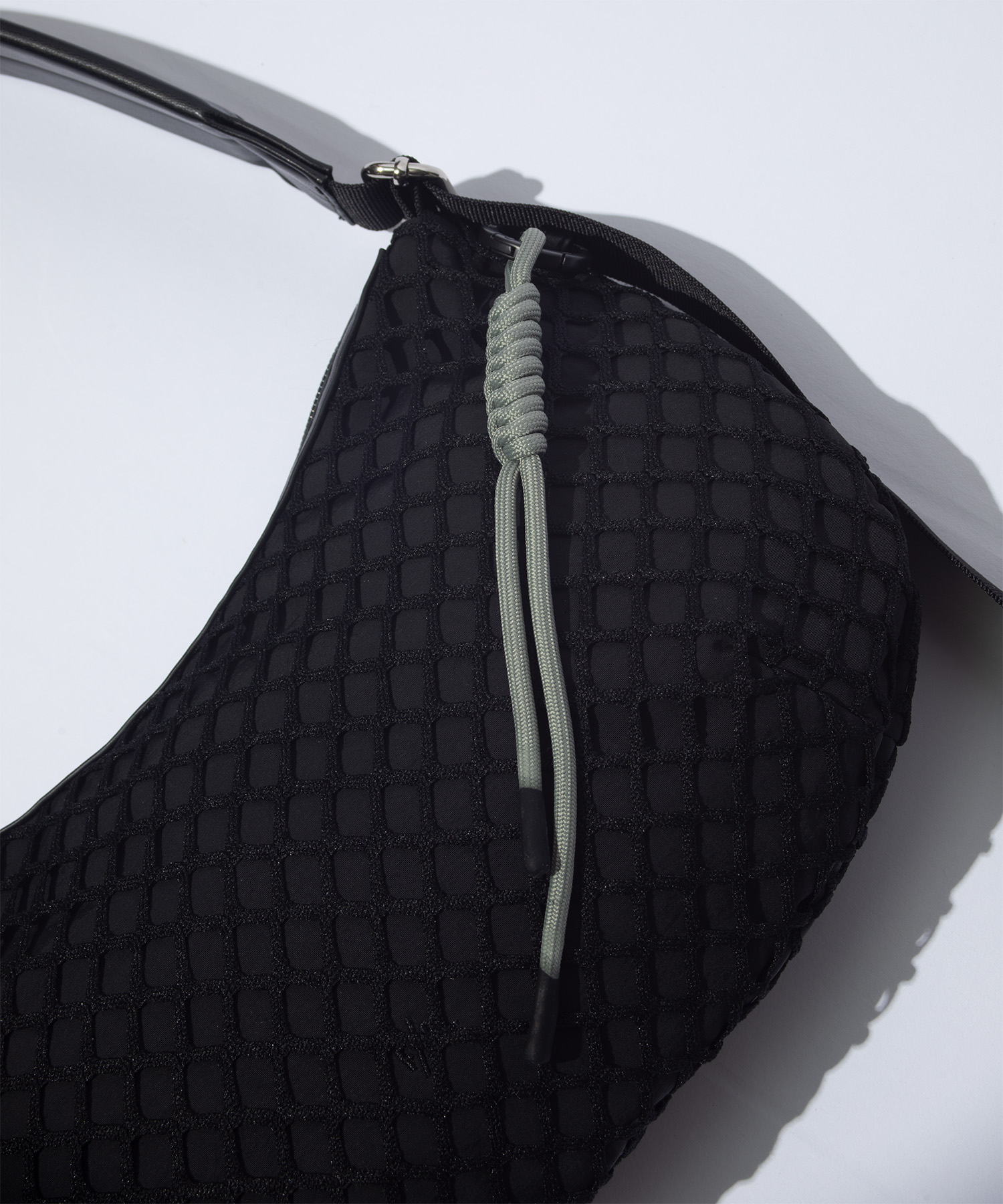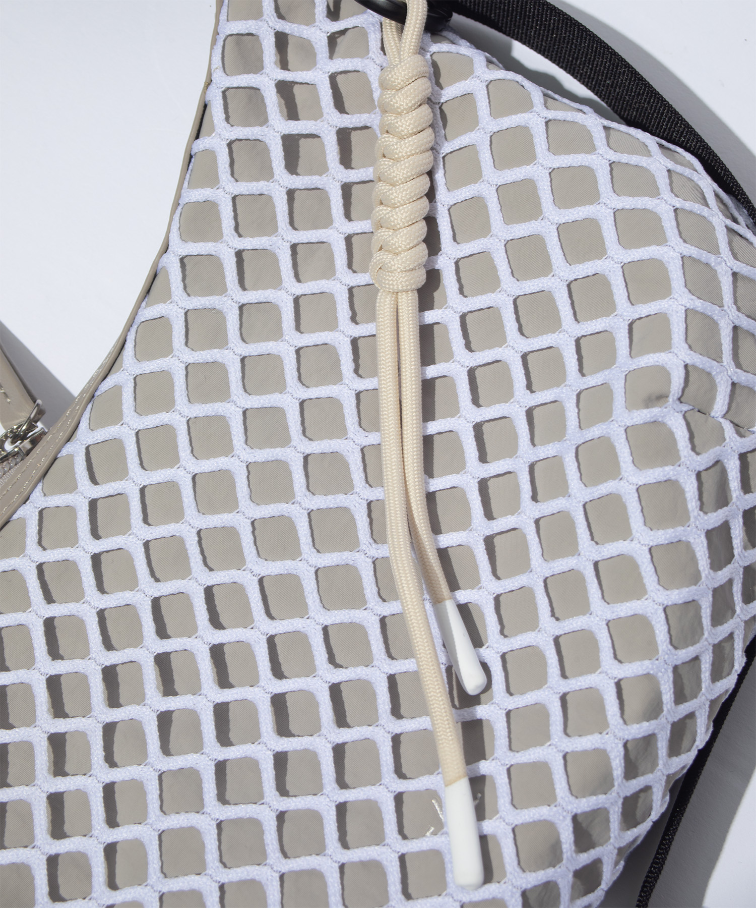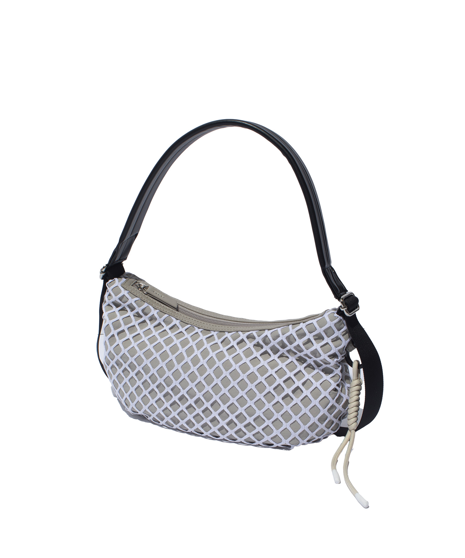 A sporty yet elegant shoulder pouch crafted from lightweight wrinkled nylon, layered with breathable mesh for an airy, seasonal feel.