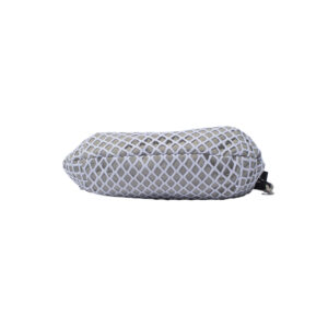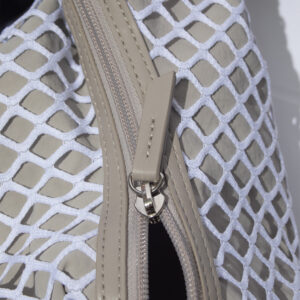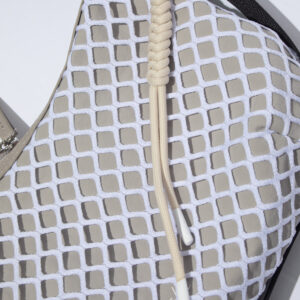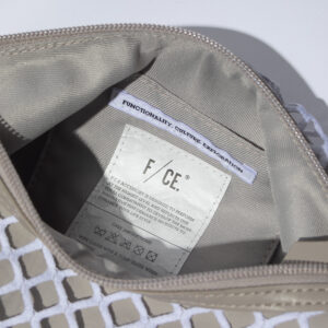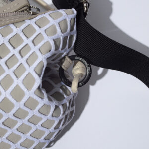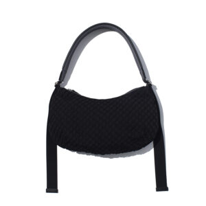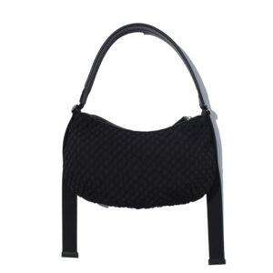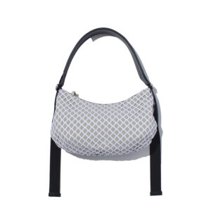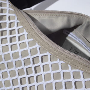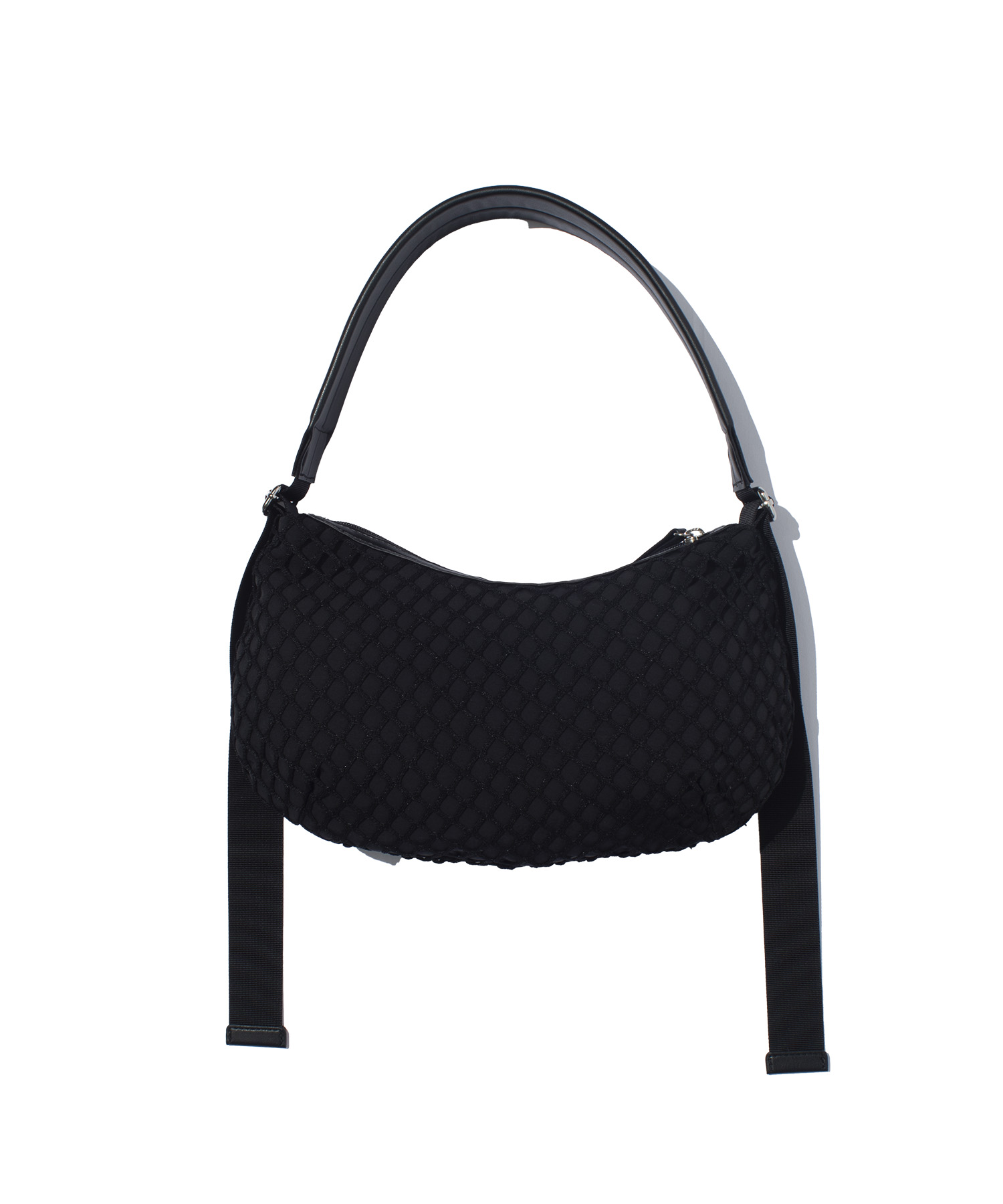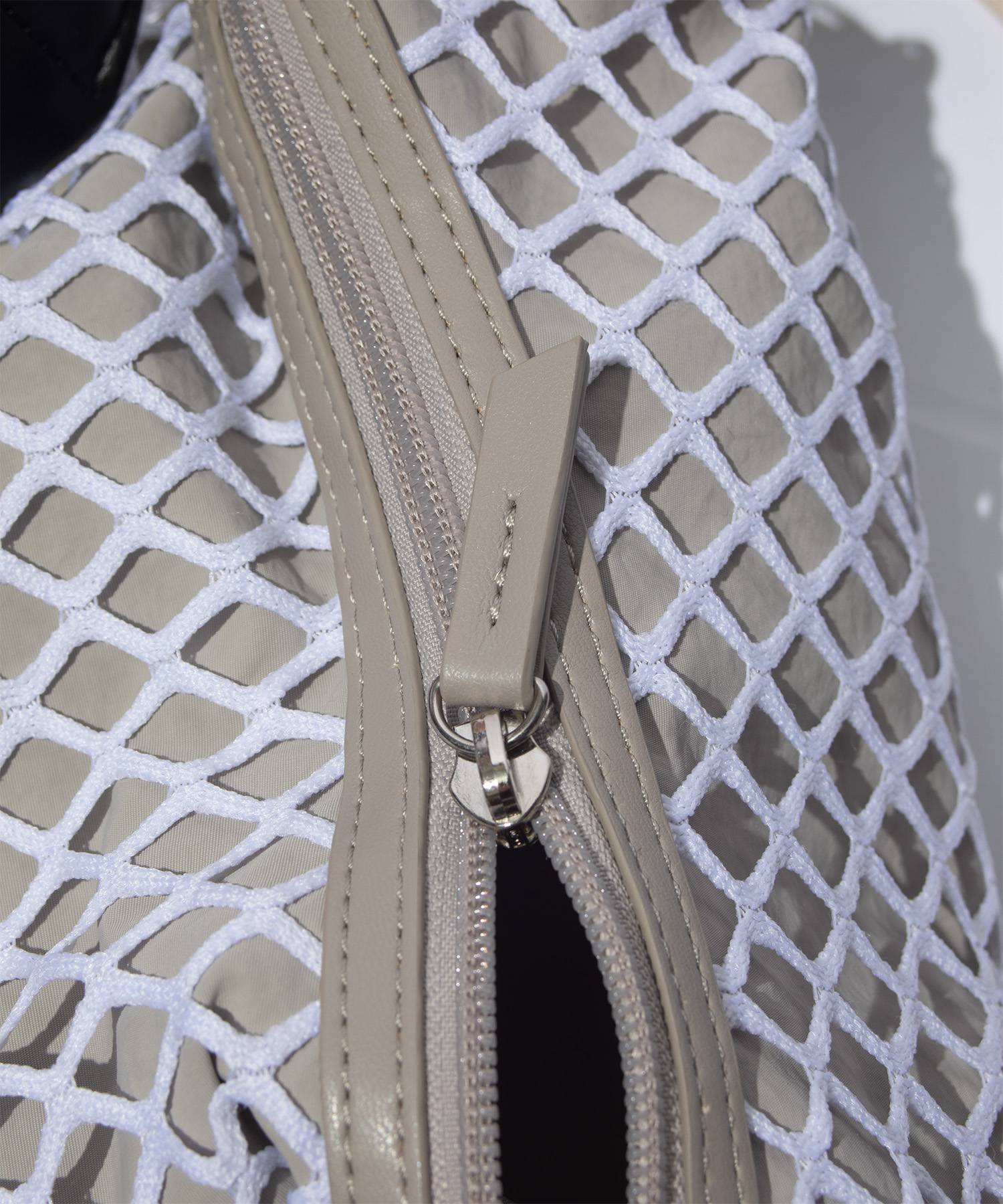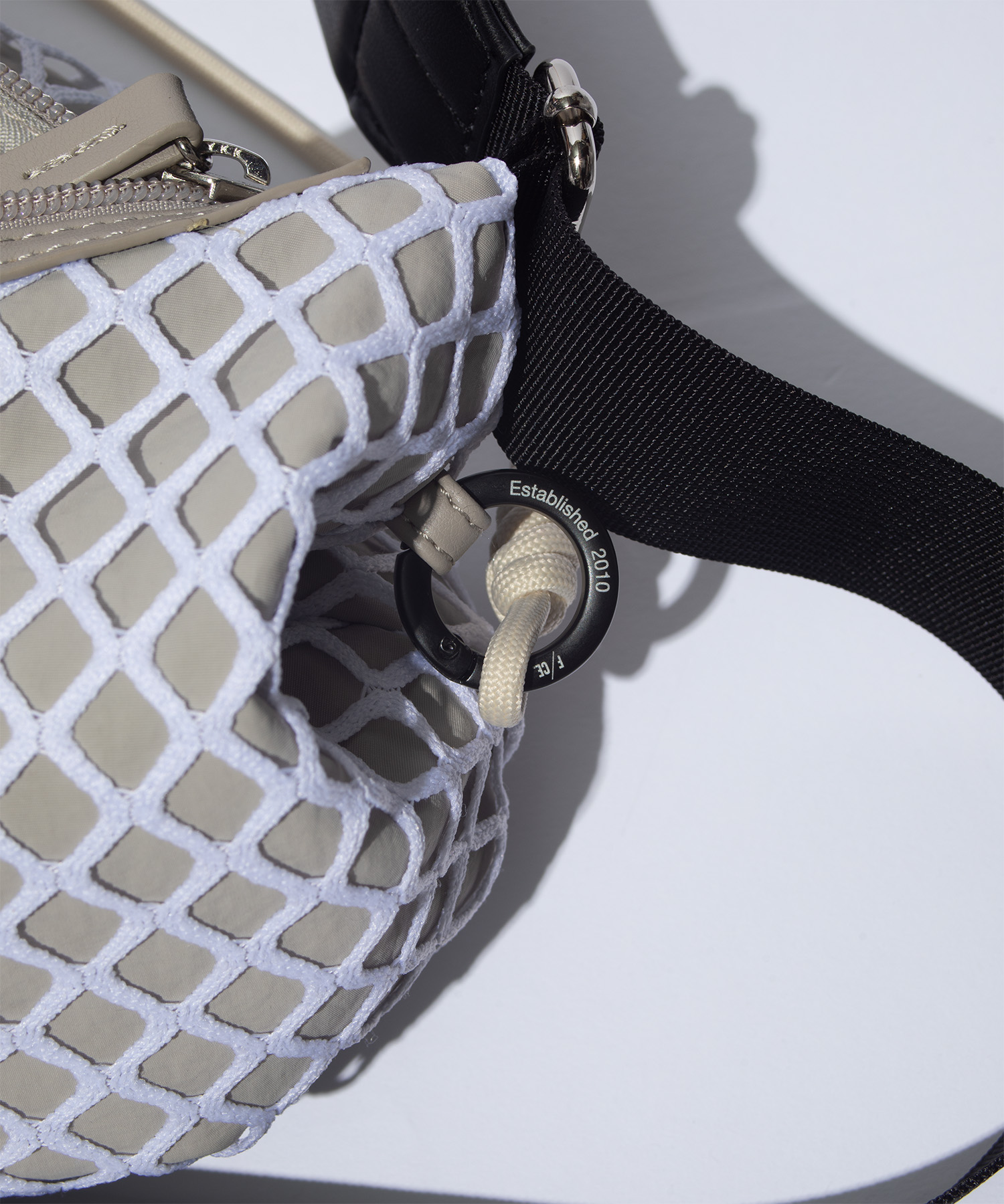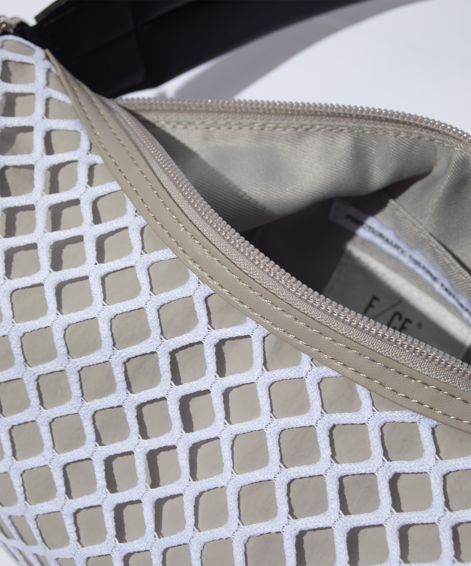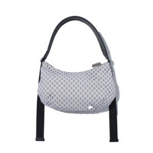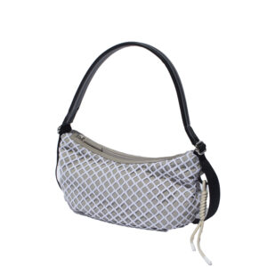 A sporty yet elegant shoulder pouch crafted from lightweight wrinkled nylon, layered with breathable mesh for an airy, seasonal feel.