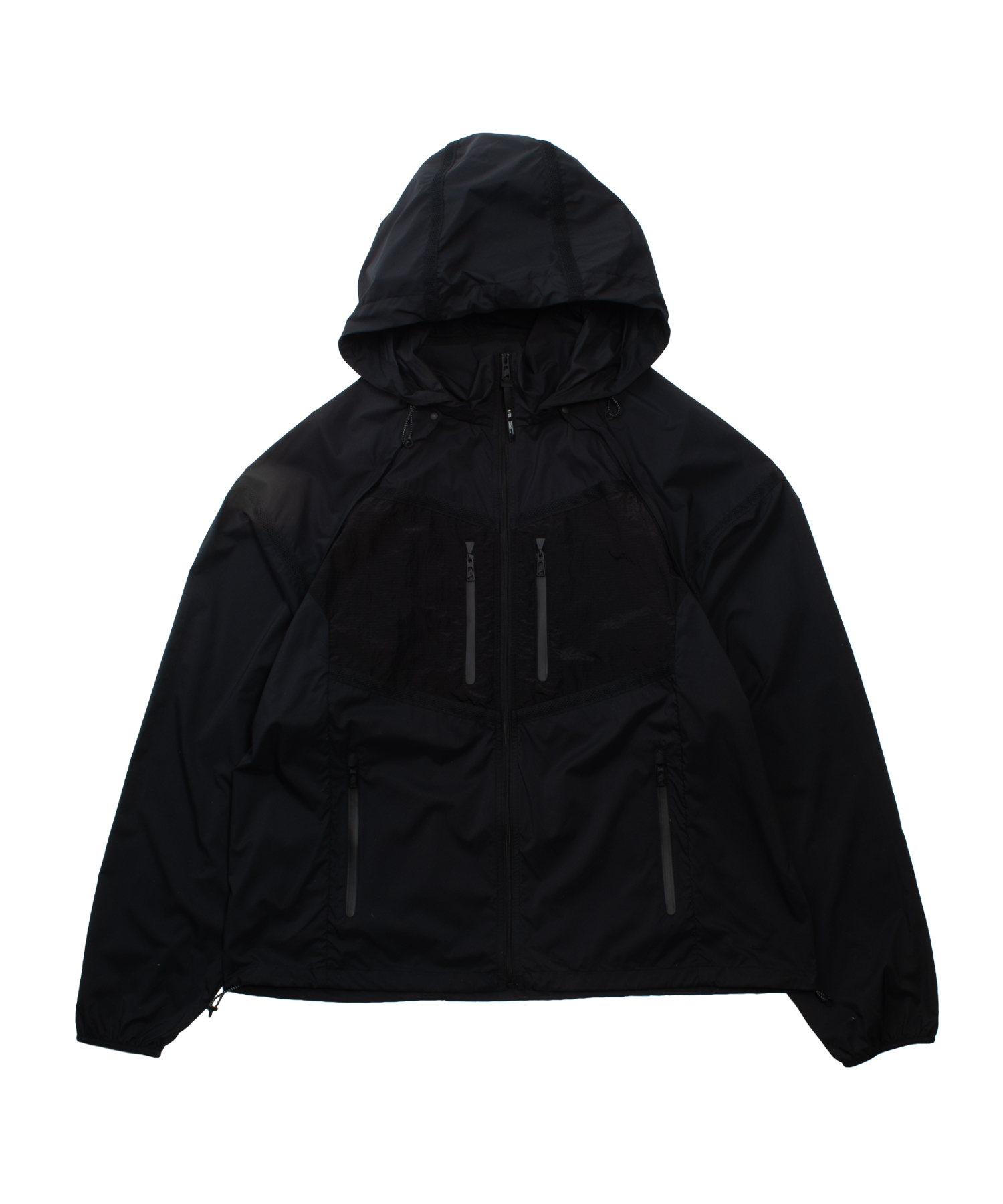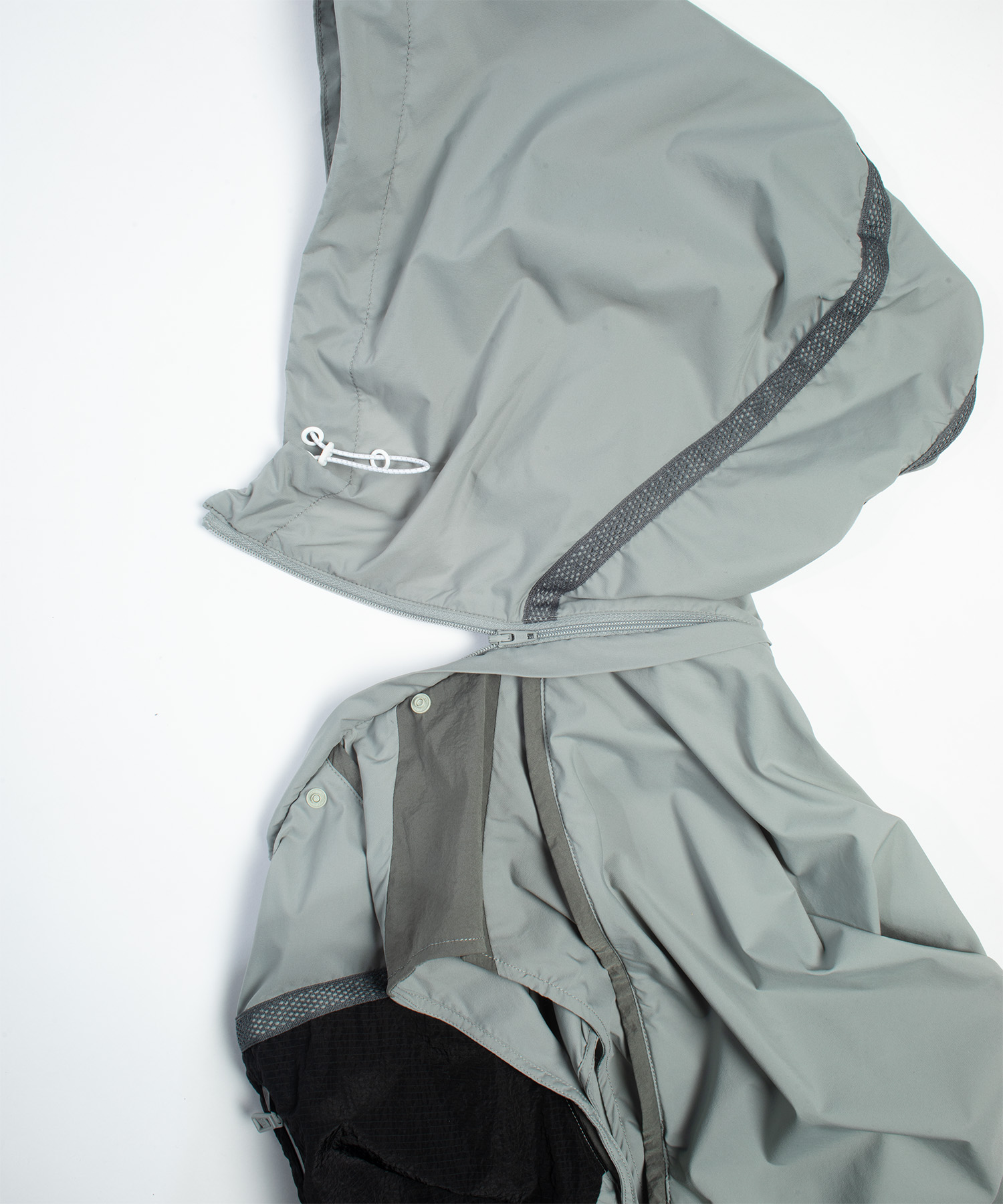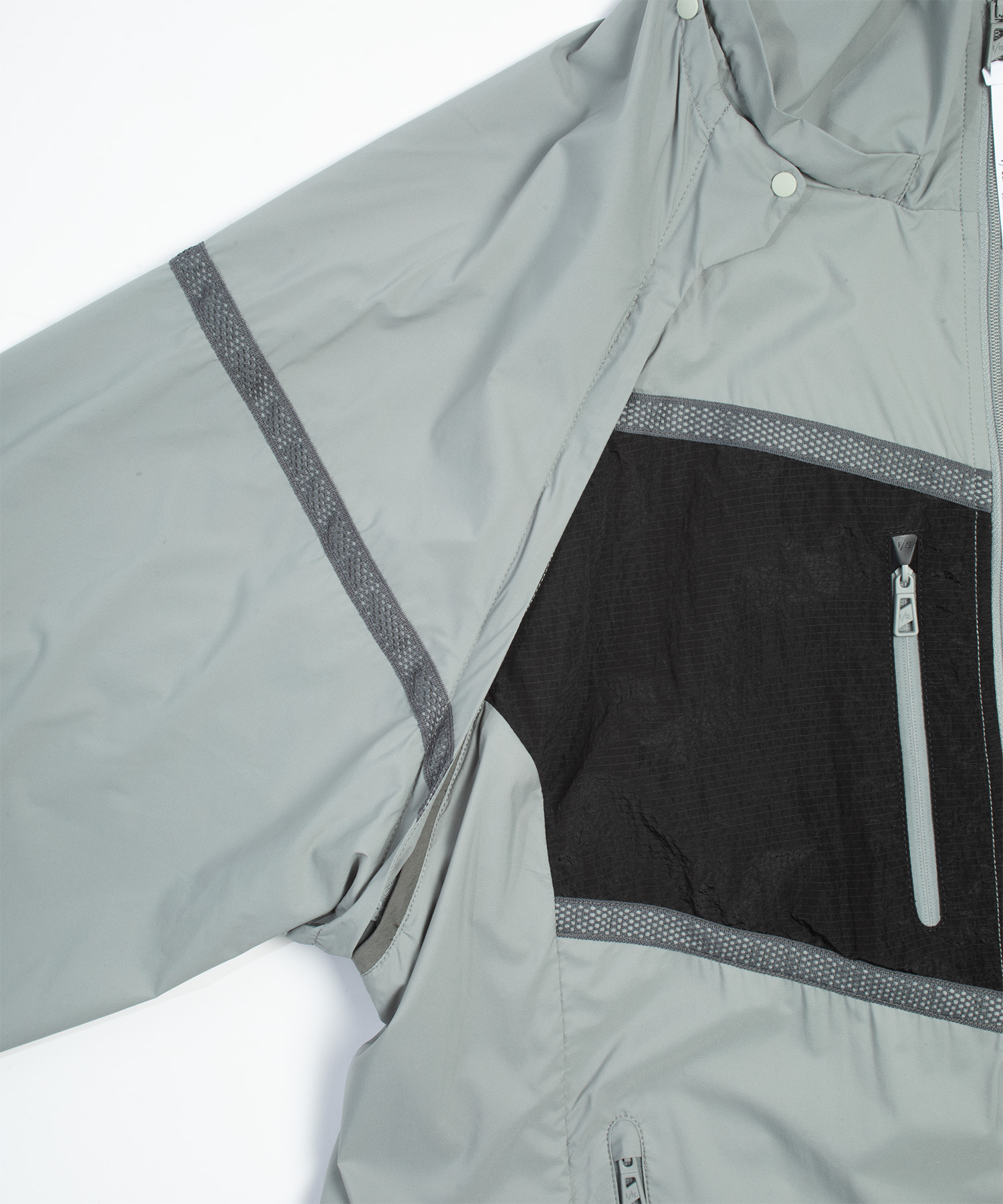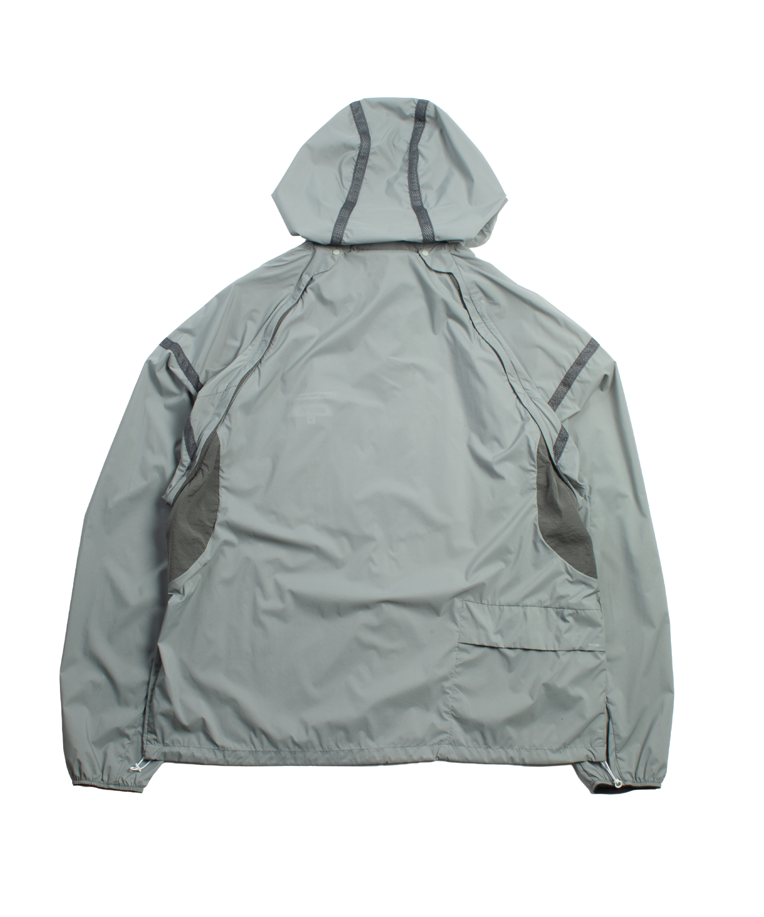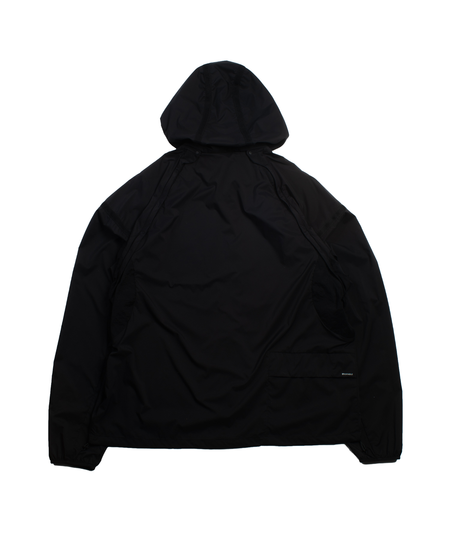 A transform jacket made from ultra water-repellent lightweight nylon. It also features a packable design that can be stored in the rear outer pocket.