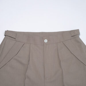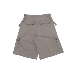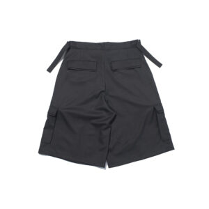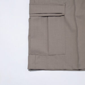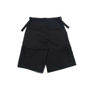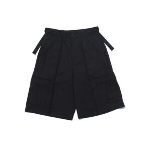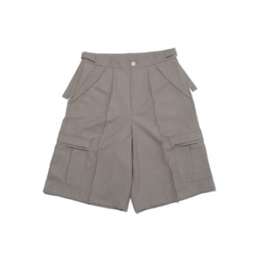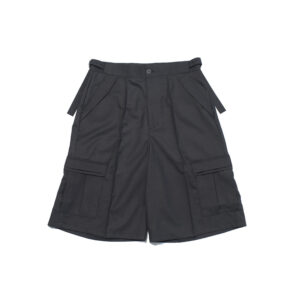 These wide shorts are made from a worsted-like fabric created by twisting 170-denier polyester yarn to replicate the smooth texture of wool.