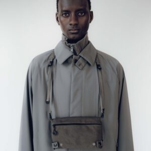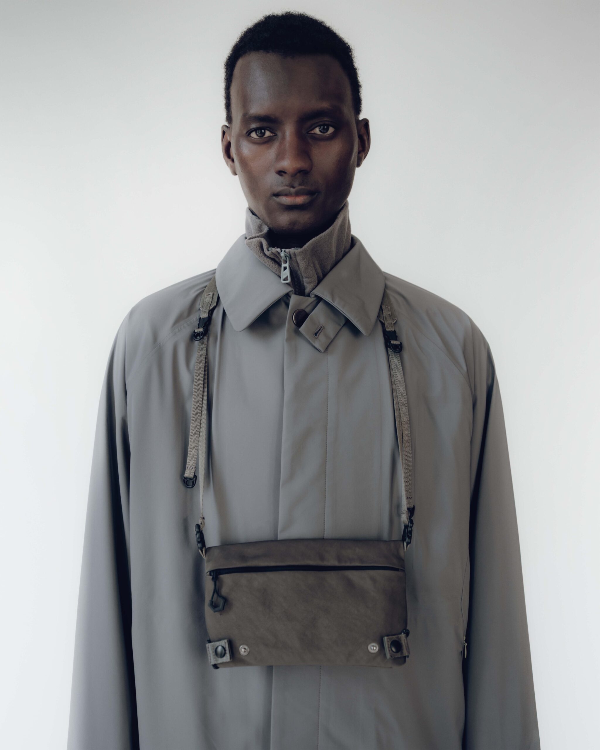New drawstring sacoche made of link twill. The drawstring can be folded over and fastened to transform it into a sacoche. It is equipped with outer pockets for enhanced daily usability. Features a shiny material with a sense of resilience and a minimalist design.