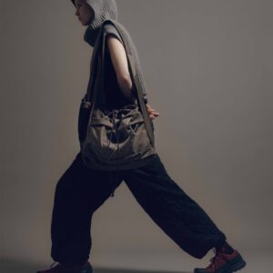Shoulder tote bag inspired by a furoshiki (a traditional Japanese wrapping cloth), with a large capacity and convenient rectangular shape. It features a flap with a drawcord closure, providing a design that conceals the bag’s contents effectively.