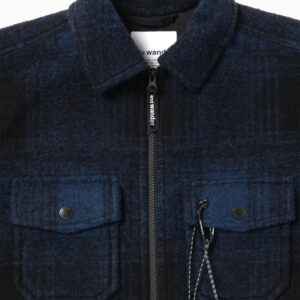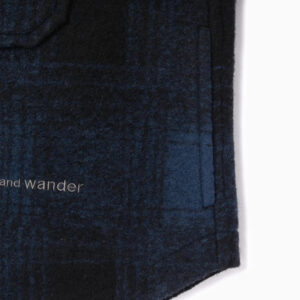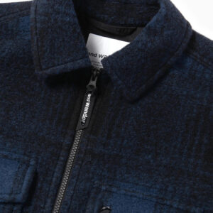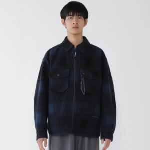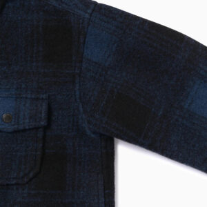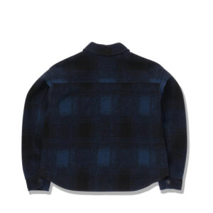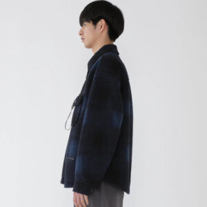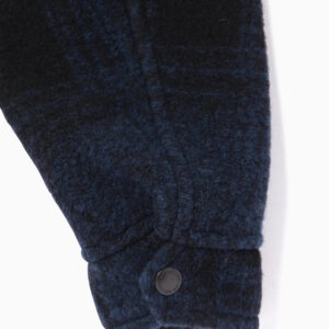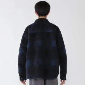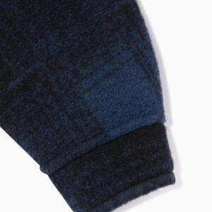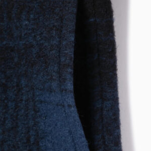 The wool-polyester blend is knitted into an original check pattern, then shrunk and brushed to give it a fluffy finish.