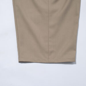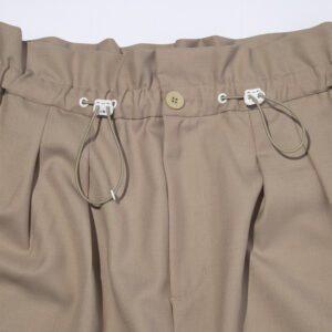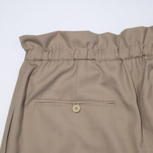 These high-waisted wide pants use a worsted-like polyester fabric crafted by over-twisting 170D yarns to mimic the refined texture of wool.