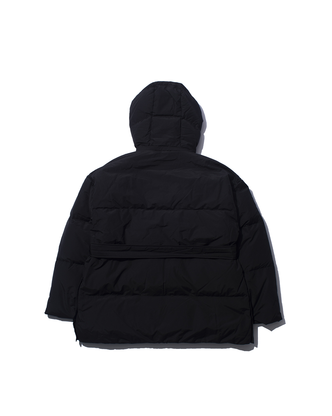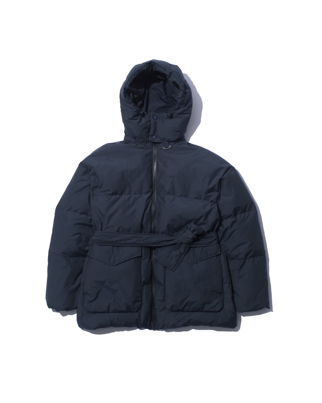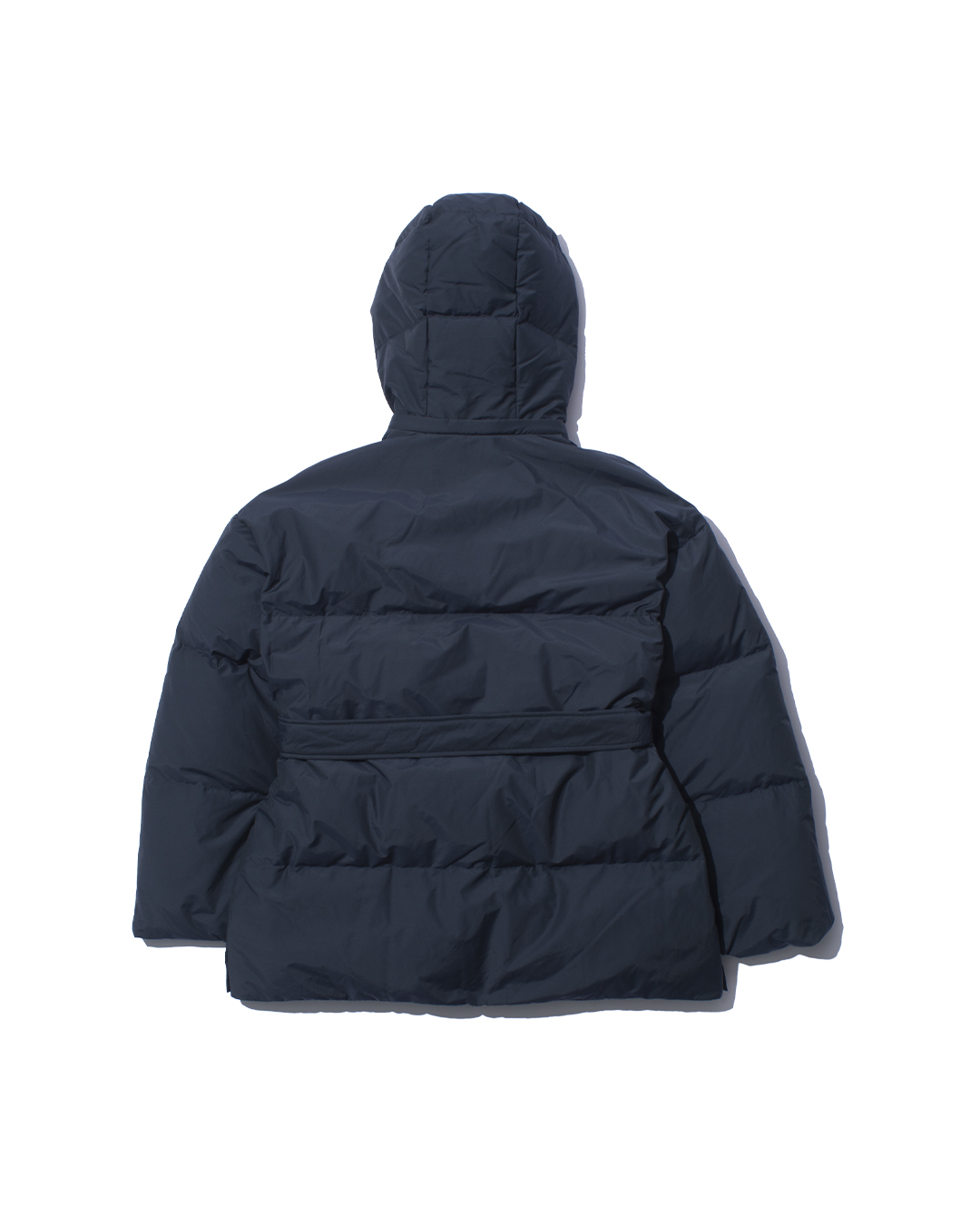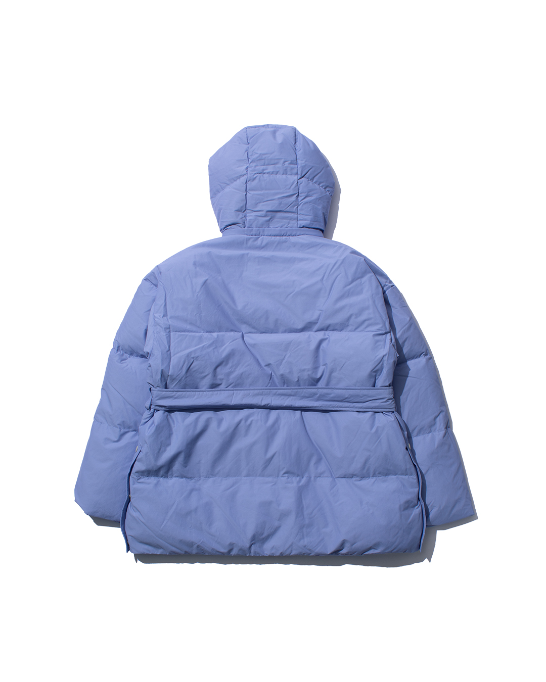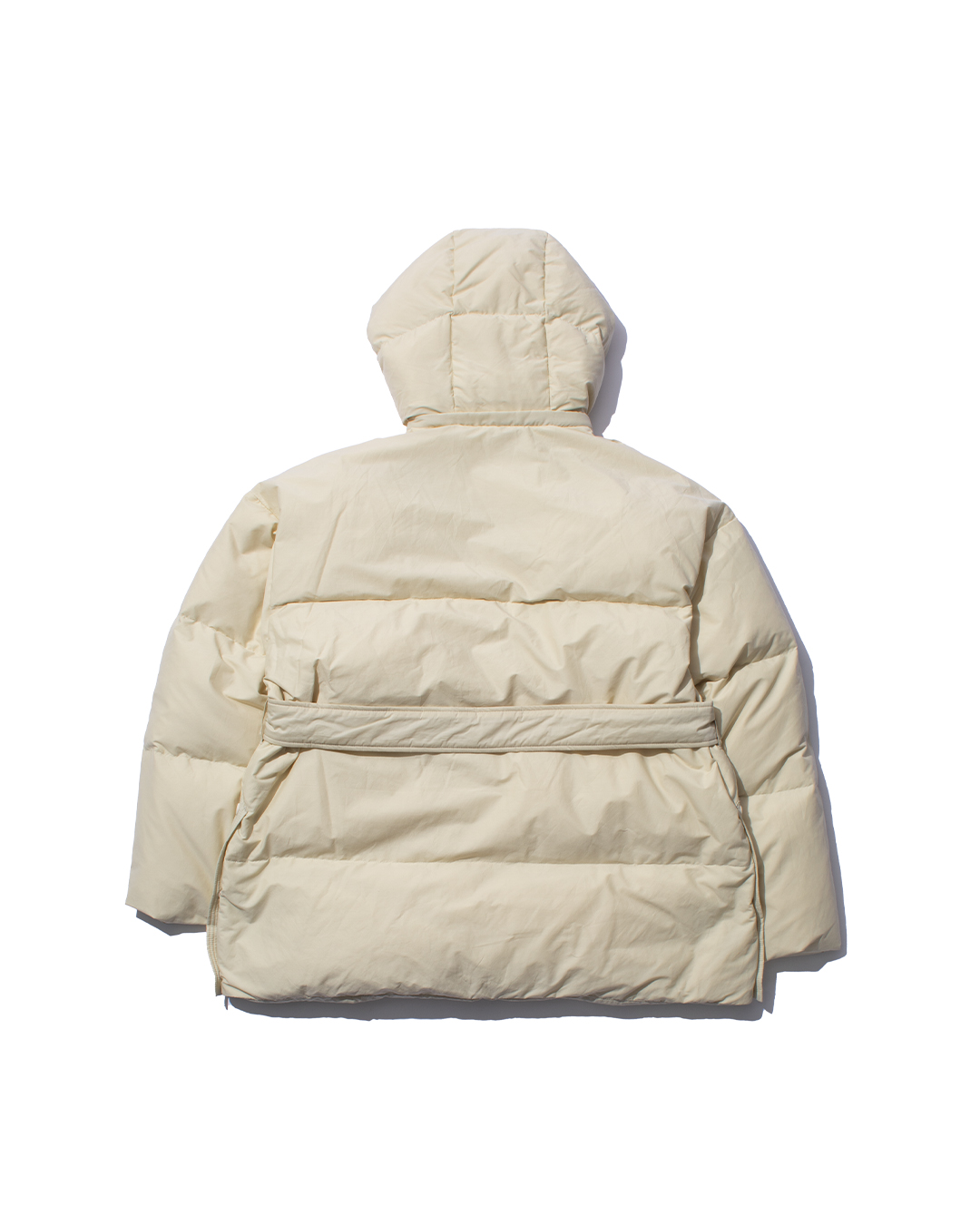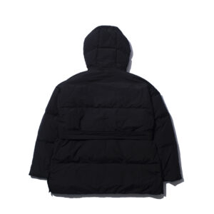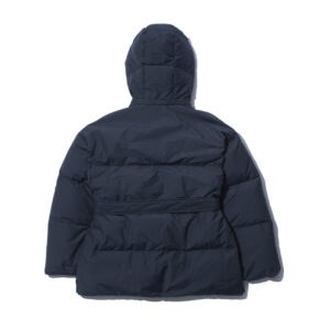 Down hooded blouson made from 650 fill-power down, carefully re-cleaned from down collected from jackets, sleeping bags, and duvets. The outer fabric is made from recycled nylon for a sustainable approach.